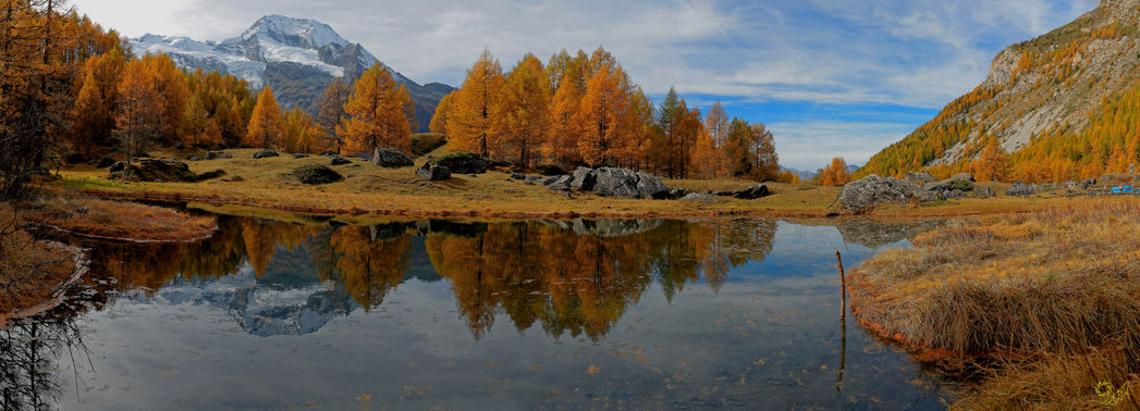 Mais la fenêtre de tir est étroite si on tient compte de tous les éléments pour la photo parfaite : météo au beau fixe sans vent (sinon pas de reflet), un petit saupoudrage de neige sur les mélèzes et au sol mais pas trop, un coup de vent et toutes les épines sont par-terre ! Un peu de neige sur le Mont Pourri n'est pas de refus non plus pour trancher avec le feu des mélèzes.